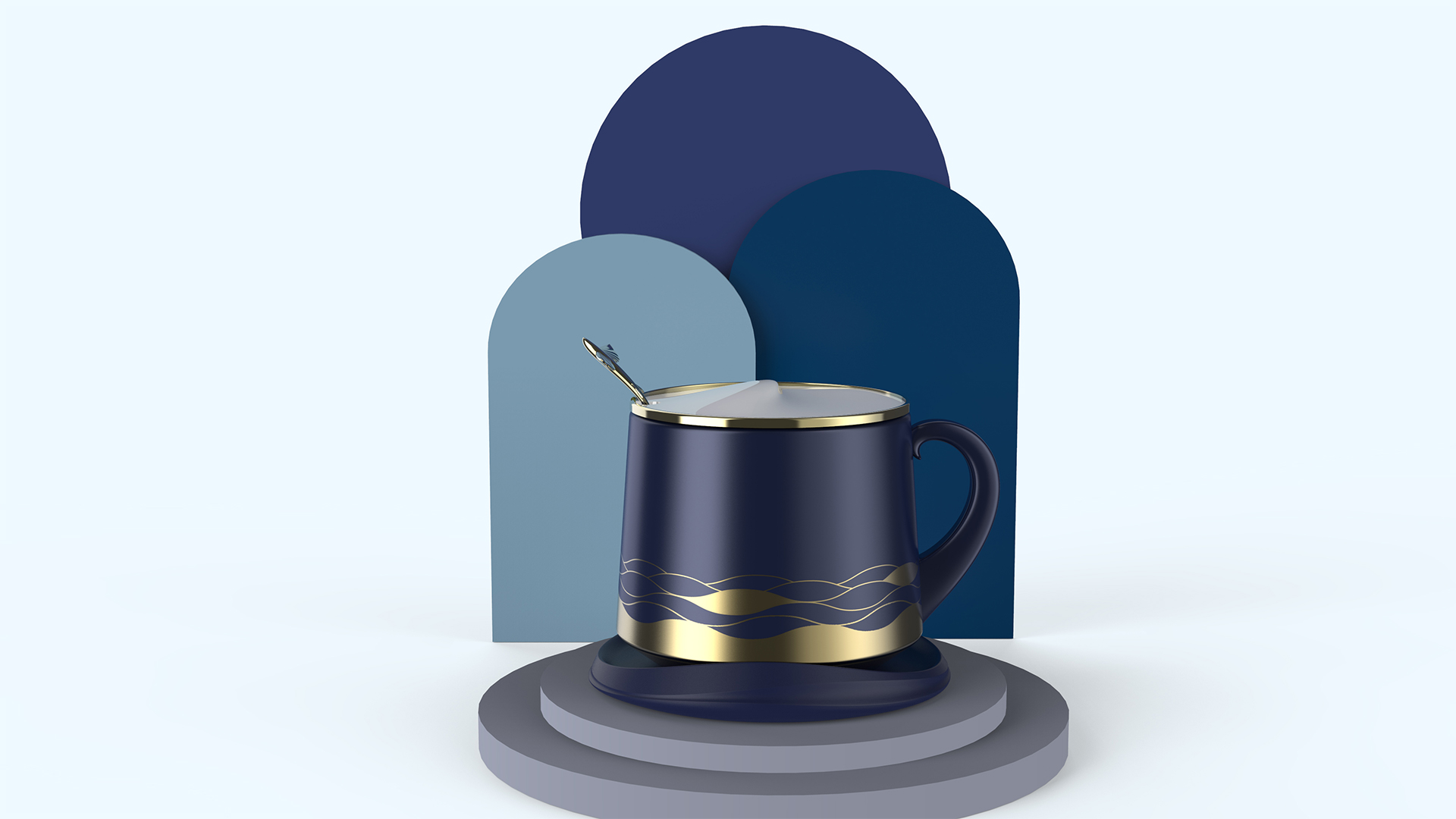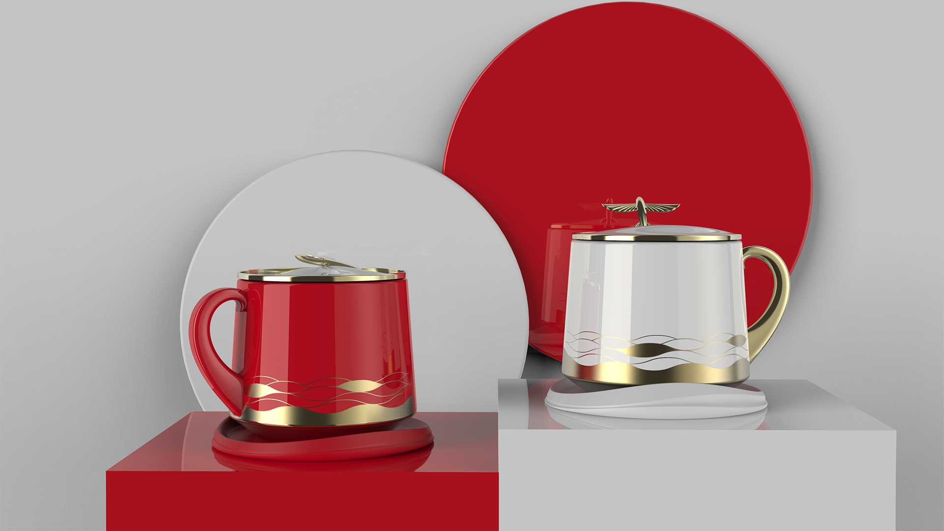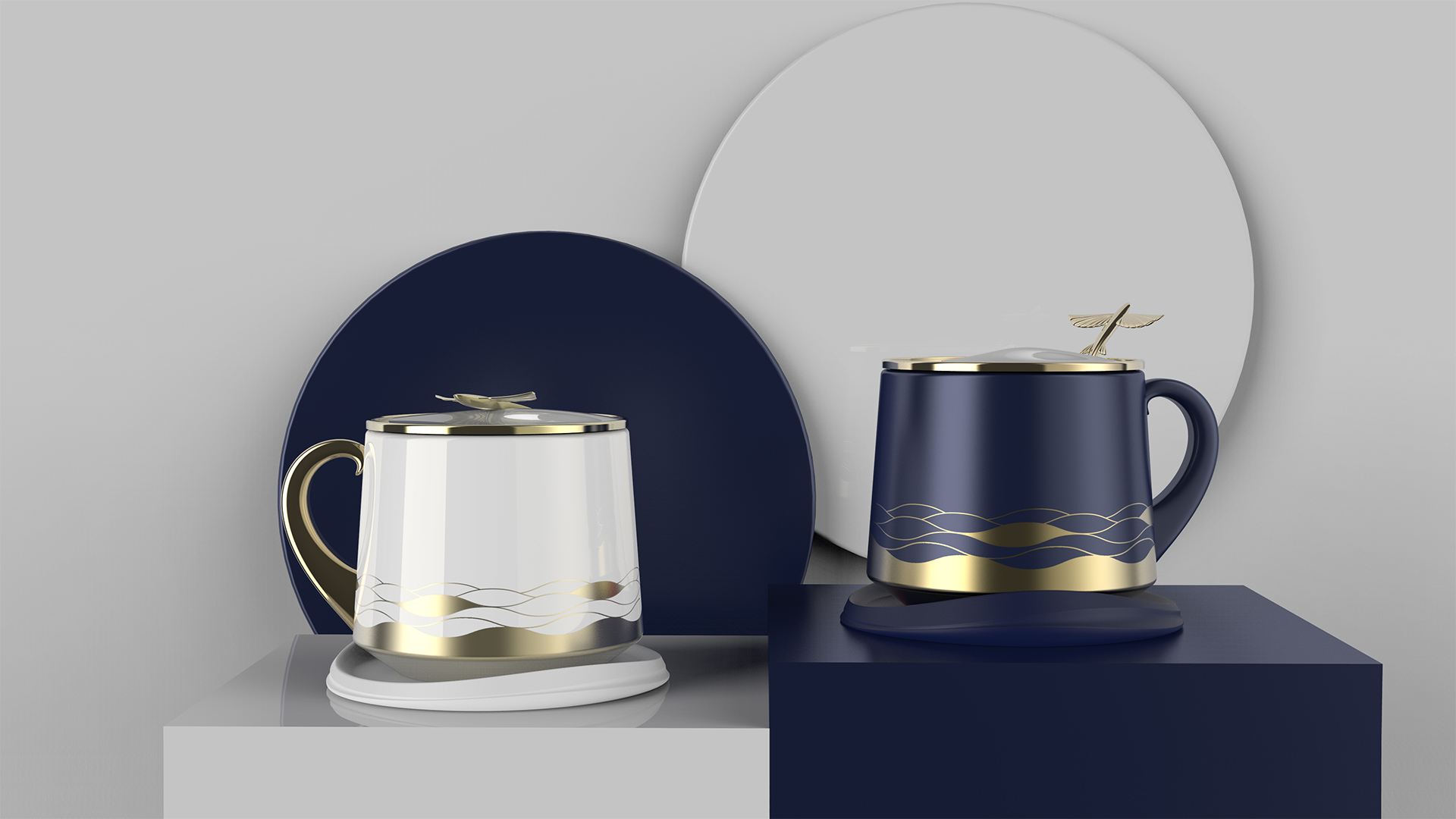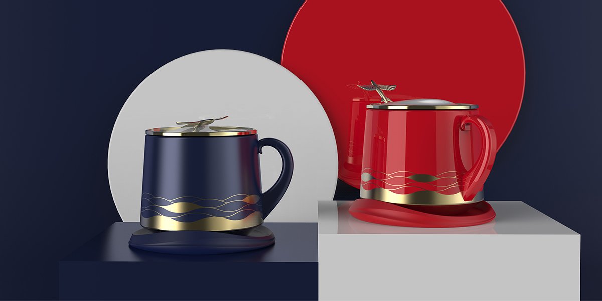 將飛魚從海面躍然而出的情景應(yīng)用在整套馬克杯上,杯墊和把手的抽象造型源自于朵朵海浪,杯蓋上塑造出一只沖出海面的飛魚,提取大海波濤起伏的線條,繪制成圖樣應(yīng)用于杯身上。