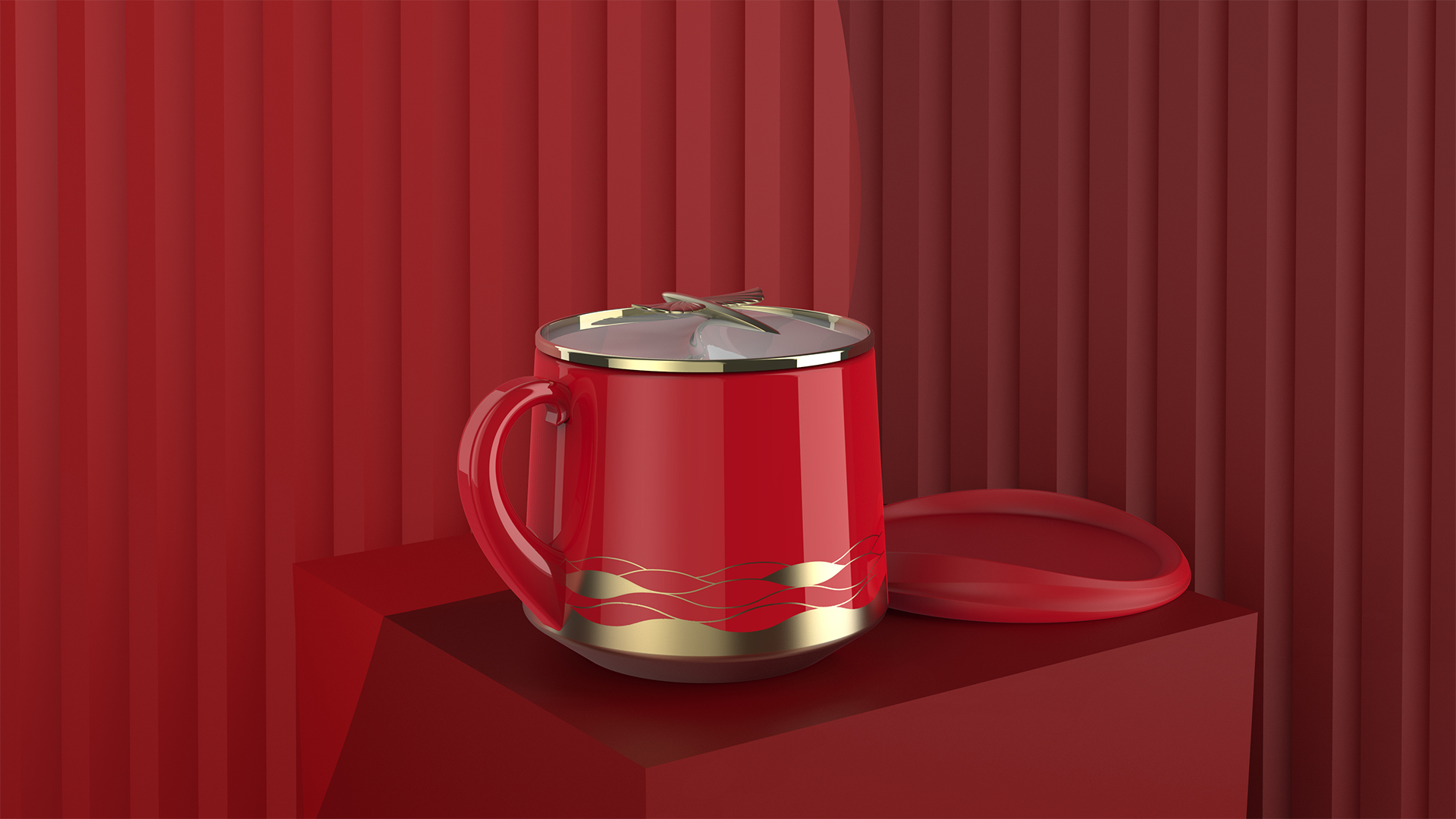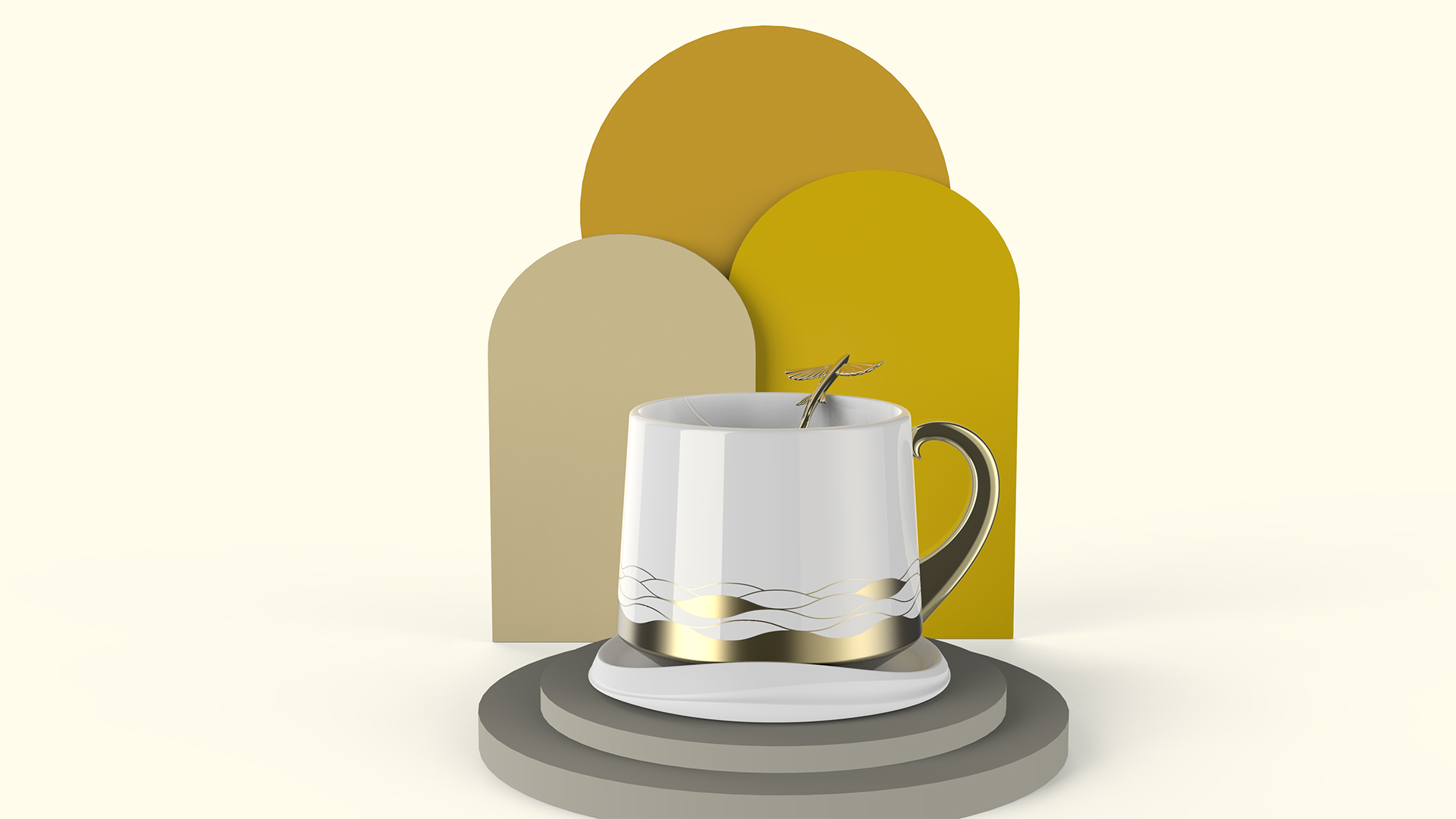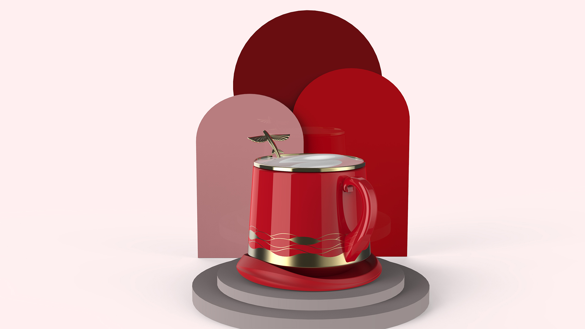 將飛魚從海面躍然而出的情景應(yīng)用在整套馬克杯上,杯墊和把手的抽象造型源自于朵朵海浪,杯蓋上塑造出一只沖出海面的飛魚,提取大海波濤起伏的線條,繪制成圖樣應(yīng)用于杯身上。