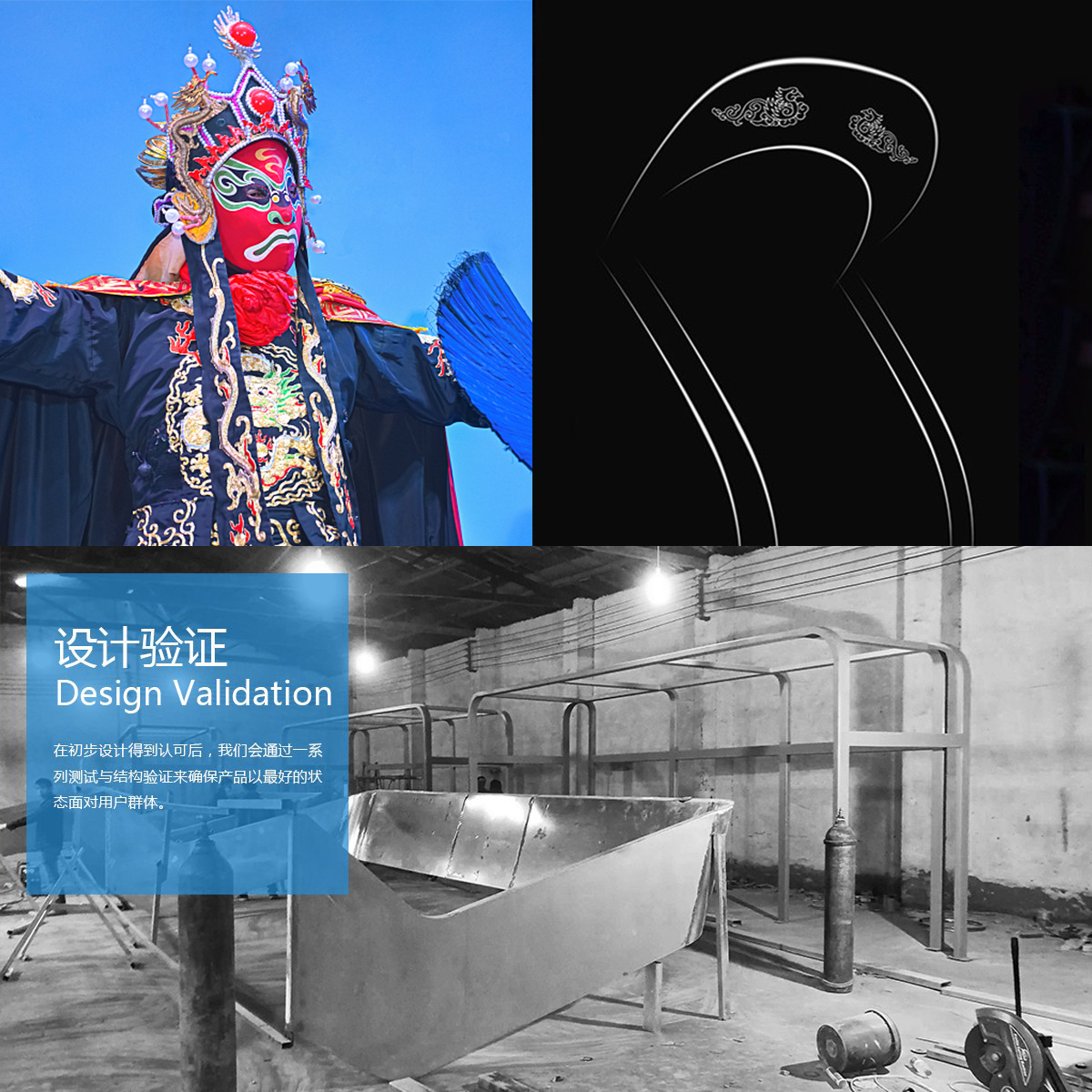 產(chǎn)品抽象化川劇臉譜裝扮的帽檐,以及帽檐兩側(cè)的緞帶,再將其重新結(jié)合為車庫的外形,并輔以傳統(tǒng)的二龍戲珠圖騰,增加其文化寓意。將城市傳統(tǒng)文化與現(xiàn)代化生活聯(lián)系,增強了城市現(xiàn)代化進程中年輕用戶群體的文化認同,同時也成為城市展示自己的一個有力的文化符號。