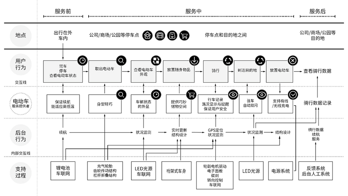 ? ? ? ? 設(shè)計團隊站在mini電動車的視角,把它看做一個人,去深入地拆解它會怎么看、怎么說、怎么和用戶互動,如何成為用戶的貼心行程伴侶。繪制用戶體驗地圖、服務(wù)藍(lán)圖是尋找優(yōu)化體驗服務(wù)點的有效工具,根據(jù)體驗流程圖中挖掘的機會點,從產(chǎn)品服務(wù)、環(huán)境和傳達(dá)等多方面設(shè)定設(shè)計所要達(dá)成的目標(biāo)。