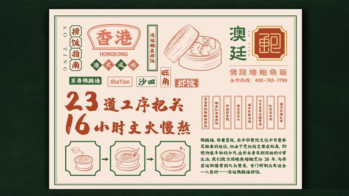 打造現(xiàn)代年輕化餐飲品牌澳廷鮑魚(yú)撈飯。原料雖貴,絕不以次充好;炮制雖繁,絕不偷工減料。澳廷佛跳墻鮑魚(yú)飯隸屬于寧波聚食力品牌管理有限公司,與寧波木馬設(shè)計(jì)共同打造策劃的餐飲品牌。