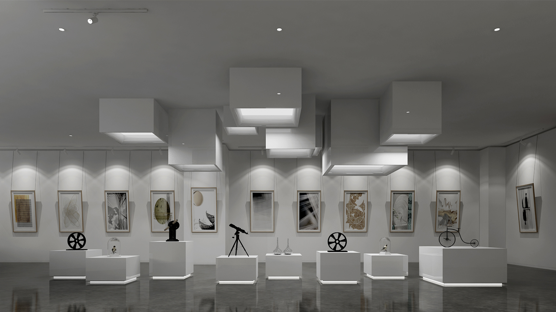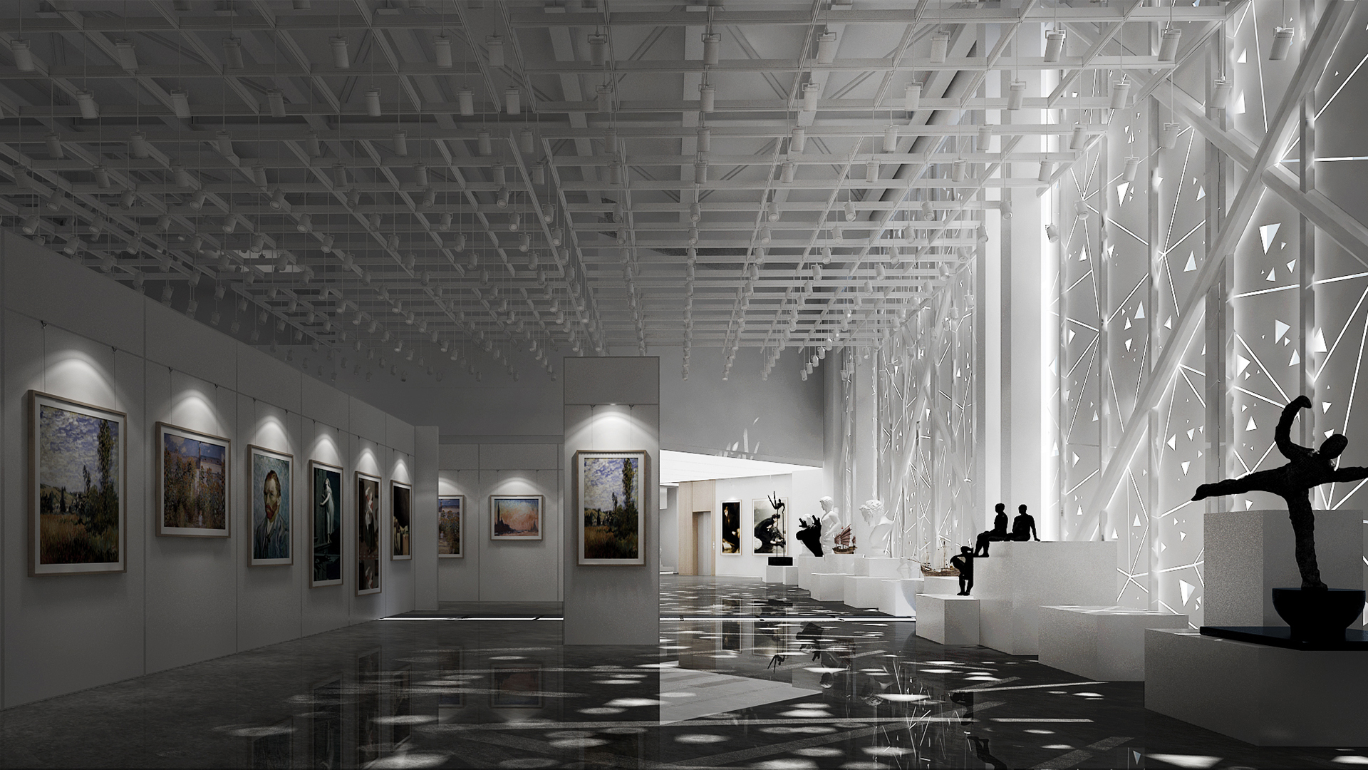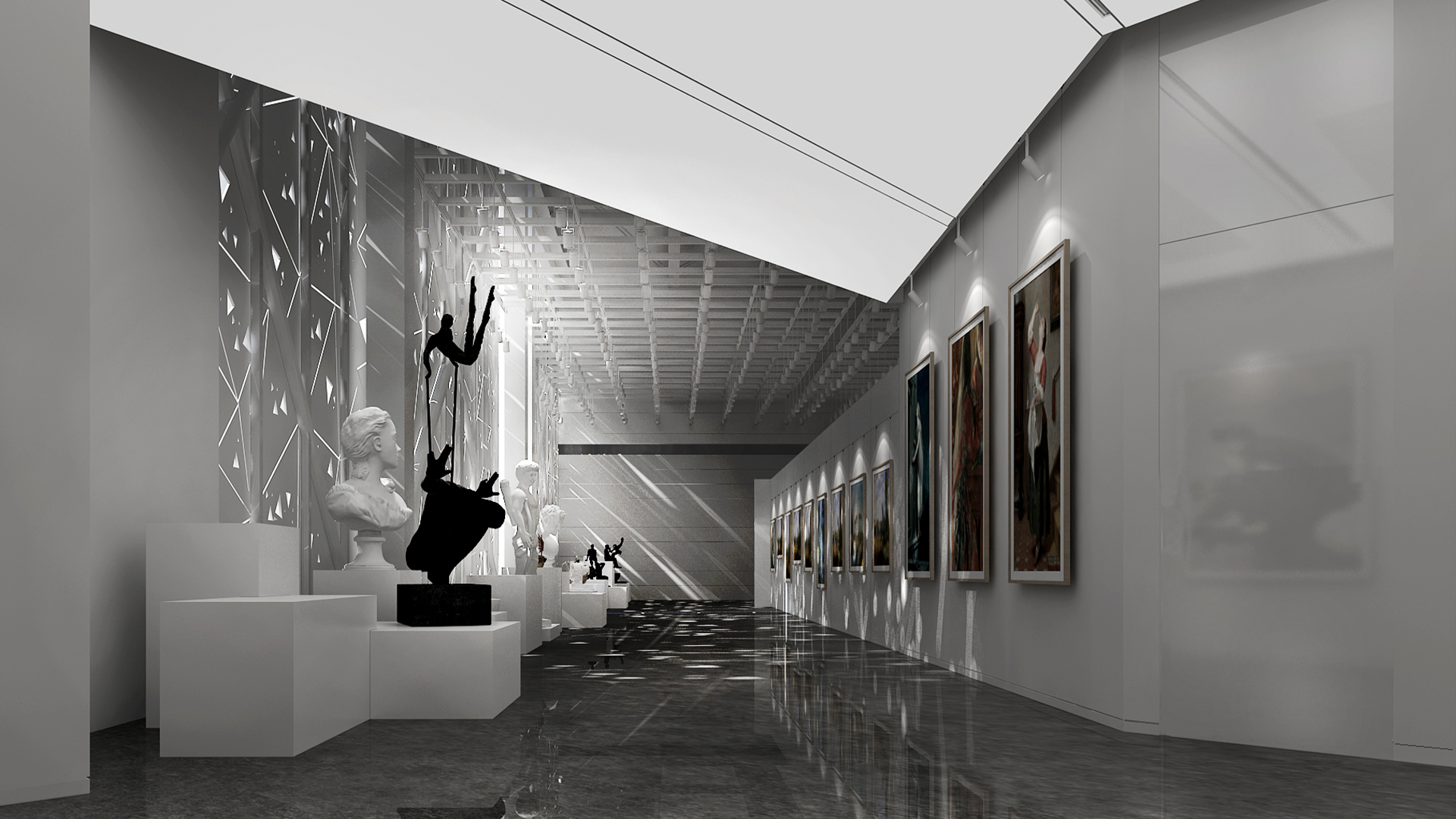 展館主要呈現(xiàn)黑白灰三色,黑白灰的色彩具有很高的審美價值,他們相互襯托,對比強烈,混合作用后會產(chǎn)生意想不到的藝術(shù)效果,產(chǎn)生千姿百態(tài)的節(jié)奏,極其富有韻律感和美感。這樣的空間不僅充滿情調(diào),更能襯托期間多彩的藝術(shù)品、豐富的畫作和內(nèi)涵的雕塑。