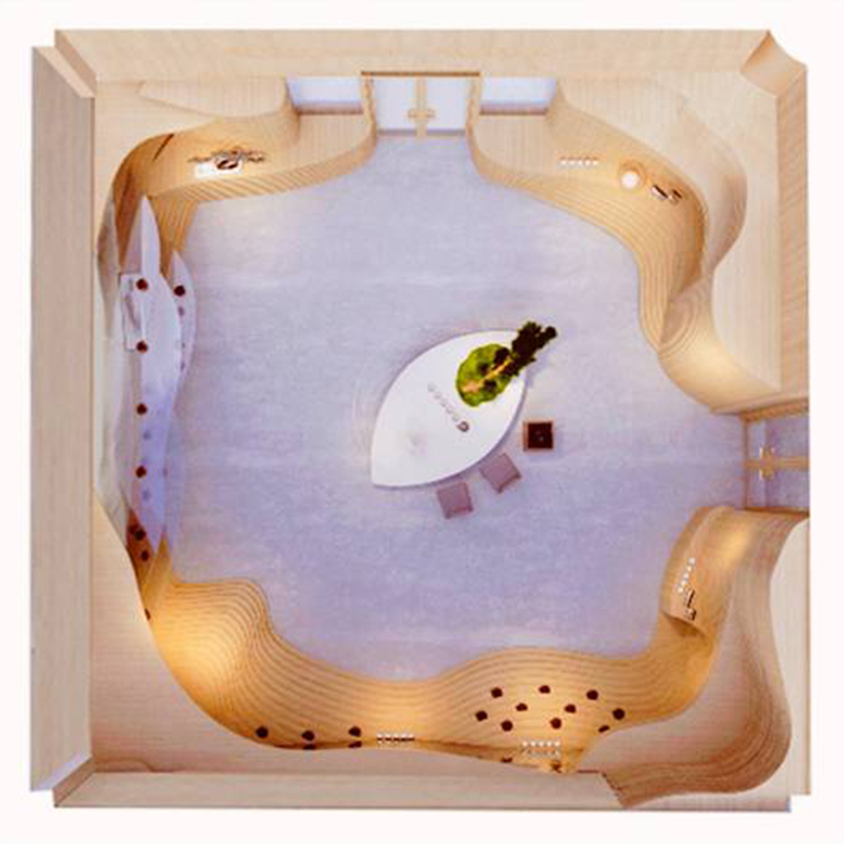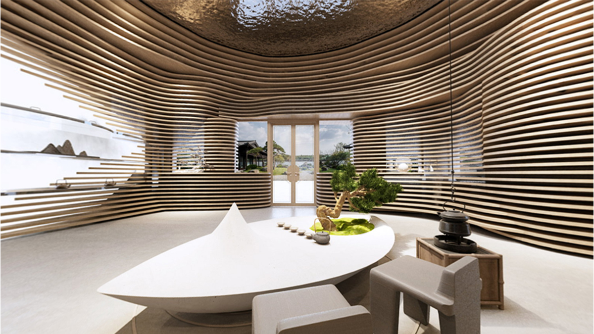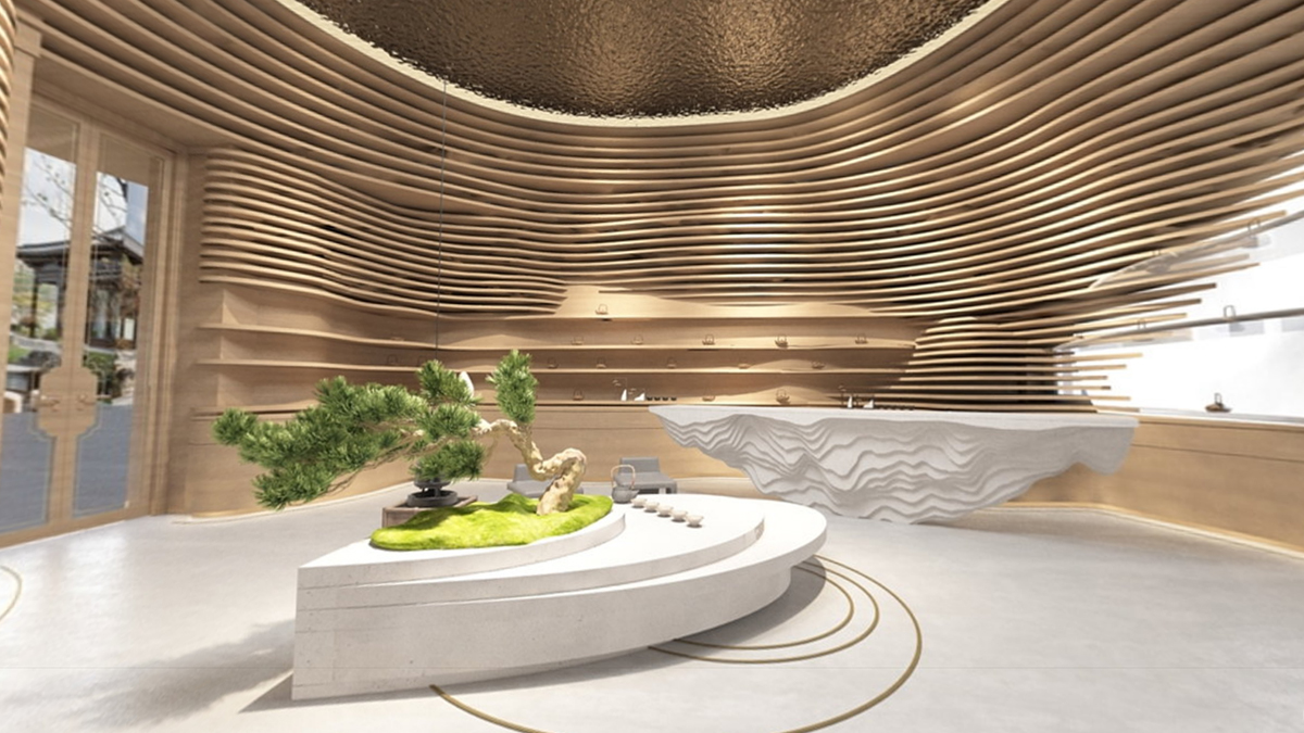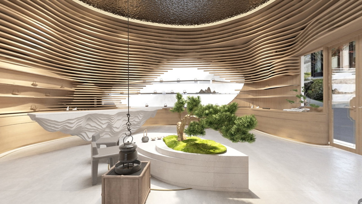 整體空間的靈感來自于自然地形——梯田, 所塑造的自然成型的層次。決定了人與動(dòng)物行走,相遇,交談,互動(dòng)的生態(tài)。茶葉本身也是從這個(gè)大自然采集而來,整體思路是希望空間能夠跳脫常規(guī)四四方方的死板規(guī)范,因?yàn)槲覀兊氖澜缡橇鲃?dòng),曲面,不定性的。回歸自然,我們本該將自然界元素融會(huì)貫通,改變我們體驗(yàn)商業(yè)跟人互動(dòng)的形態(tài),才能從底層反應(yīng)茶這件事請(qǐng)的本質(zhì)。