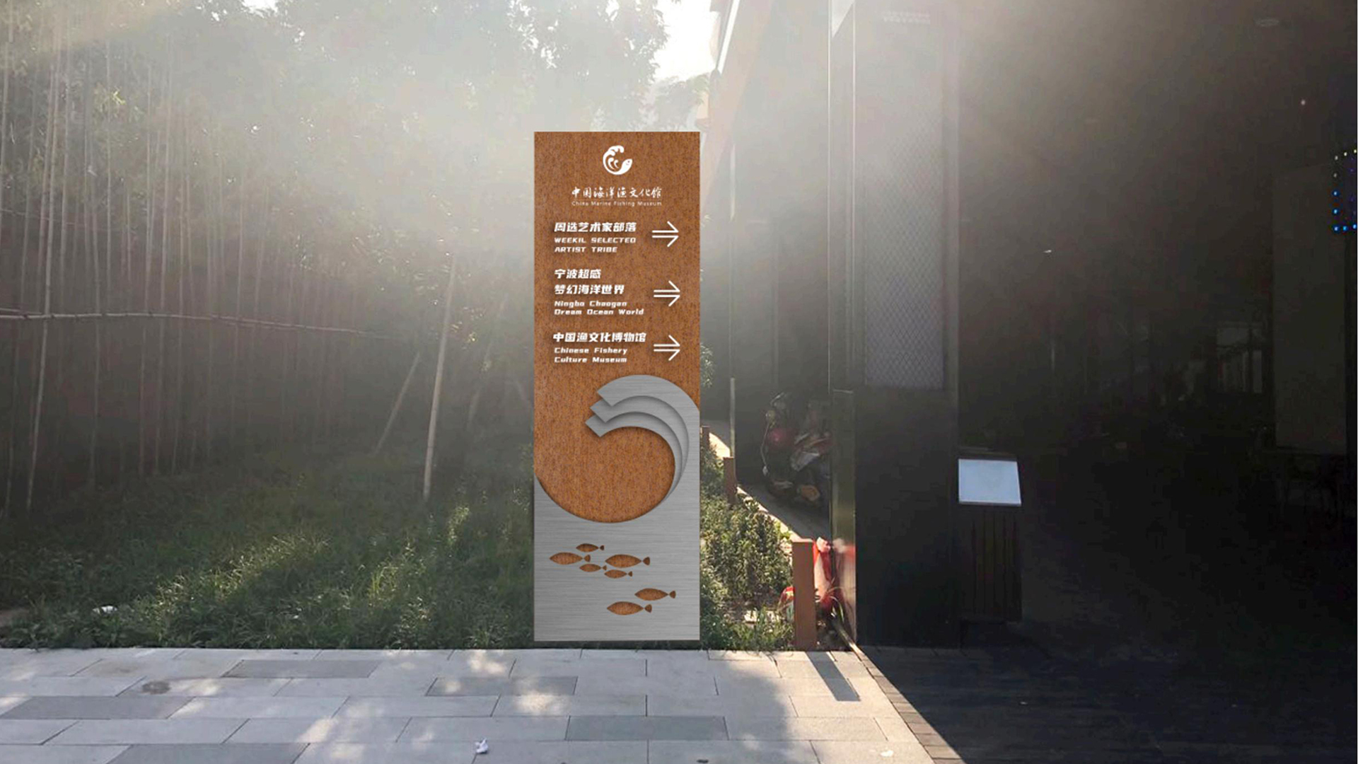 該館以歷史為脈絡,部分還原了漁村舊貌,運用AR、裸眼3D等技術,展現(xiàn)了象山以海為生、與海共榮的海洋文化發(fā)展歷程和我國海洋漁文化的多樣性和豐富性。同時,中國海洋漁文化館充分利用舊廠區(qū)空間,建設了城市會客廳、文創(chuàng)非遺孵化區(qū)等項目。我們團隊將導視設計以漁文化為切入點進行。