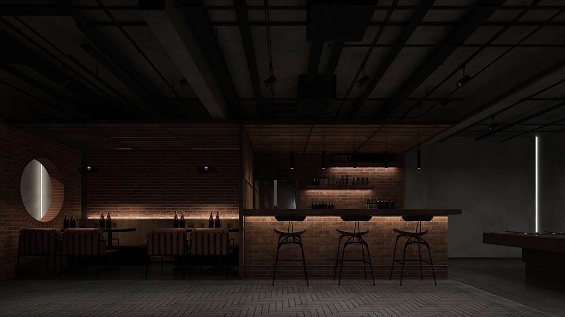 酒吧寬闊的通道讓吧臺、酒墻、沙發(fā)區(qū)分散開來,讓在不同區(qū)域活動的人在碩大的空間中找到自己的歸屬。光在整個空間中扮演著各種角色,有些讓人沉靜,有些讓人興奮。石墻、鵝卵石,最純粹的建筑元素在精心的排布和設(shè)計中發(fā)揮了其美的特點。墻面構(gòu)筑元素采用了泡沫紅陶瓷用來模擬紅磚材料,防水防火?;璋档沫h(huán)境下,人們才真正可以與世隔絕,享受自由。