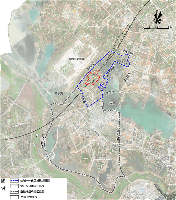 The scope of design extends eastwards to Wuhan Ring Expressway and Houhu, southwards to Fourth Ring Road, westwards to Airport Expressway and the eastern boundary of Wuhan Tianhe International Airport, and northwards to Linkong South Road, covering an area of about 7.4 km2.
